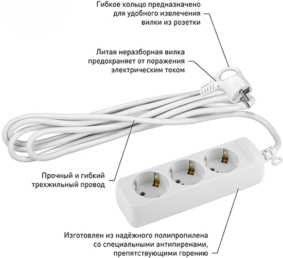 Удлинитель бытовой с заземлением предназначен для подключения электроприборов и электроинструментов мощностью до 3,5 кВт.