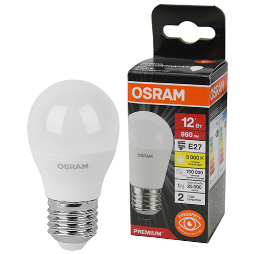 Лампа светодиодная Osram LVCLP100 12SW/830 230V FR E27 (P45 шар, 220 В, 12 Вт, 960 лм, 3000 К)