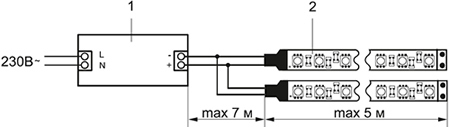 Максимальное удаление светодиодной ленты от блока питания без потери освещенности: не более 7 м.