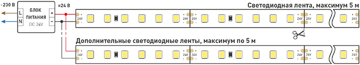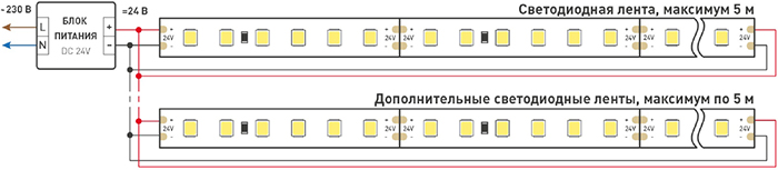 Схема подключения нескольких светодиодных лент с одной стороны: