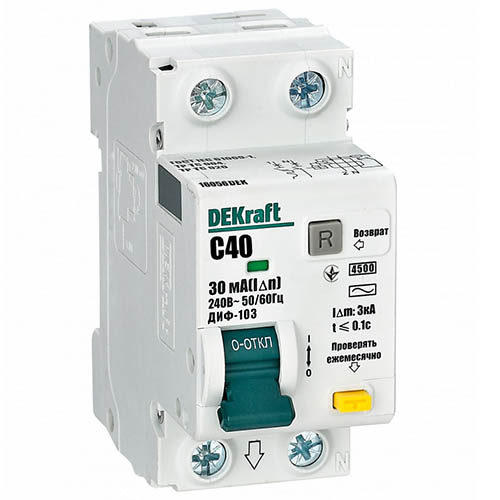 Автоматический выключатель дифференциального тока DEKraft ДИФ103-4.5кА-1N-040A-030-C (1P+N, 40 А, характеристика C, 30 мА, 4,5 кА, тип АС)