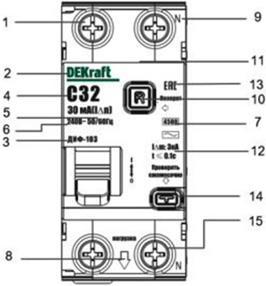 |  | 1 - клеммы для подвода питания (фаза и N соответственно). 3 - серия. 5 - номинальная частота. 7 - отключающая способность. 9 - маркировка N-полюса. 11 - электрическая схема. 13 - знак сертификации. 15 - клеммы для подвода нагрузки (фаза и N соответственно). |