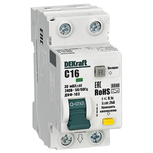Автоматический выключатель дифференциального тока DEKraft ДИФ103-6кА-1N-16А-30-А-C (1Р+N, 16 А, характеристика C, 30 мА, 6 кА, тип А)