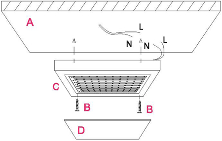 - Прикрепите светильник на выбранную поверхность с помощью саморезов (в комплекте).