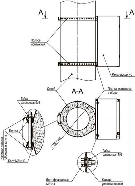 | Крепление корпуса к столбу скобой | Крепление корпуса к столбу монтажной полосой |
