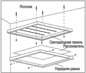 Накладной монтаж светодиодной панели осуществляется непосредственно на поверхность потолка с креплением светильника через отверстия в корпусе.