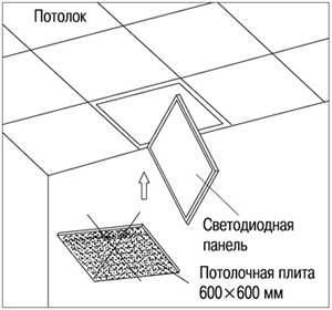 Панель со стандартным размером устанавливают на место потолочной плиты в межпотолочное пространство.