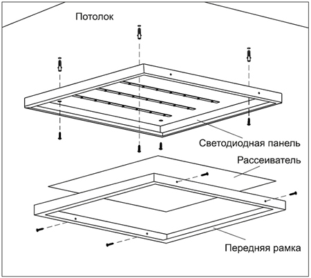 Светодиодную панель установить на место потолочной плиты 600 x 600 мм в межпотолочное пространство.