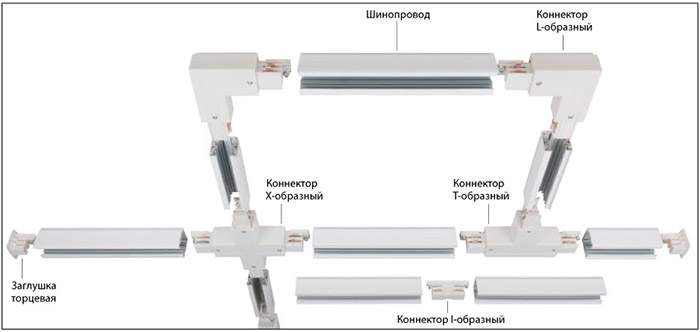 В комплект торцевых элементов входит также сетевой коннектор для подключения сетевого напряжения к шинопроводу трековой системы.